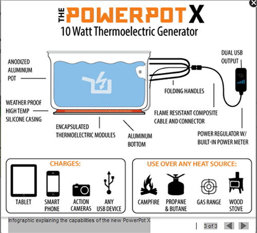 Also of possible interest to outdoor enthusiasts is the PowerPot X that was demonstrated at CES. The cooking pot uses thermoelectric technology – taking a temperature difference and turning it into electrical power - to charge two mobile devices at once through a USB port. The idea is to charge batteries while cooking in the great outdoors.