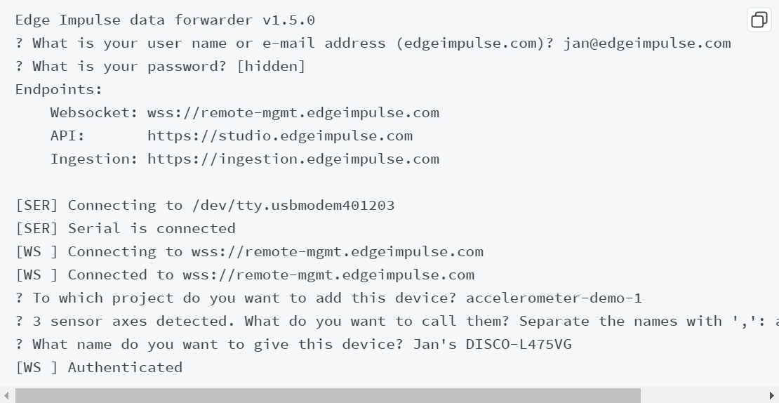 • The second tool, the Data Forwarder, is used in conjunction with the serial daemon (Figure 3). Working in concert, they allow a sensor device that lacks built-in wireless connectivity to connect to Edge Impulse through an internet-connected desktop computer via a wired serial connection. Devices simply write their sensor data in a comma-separated or tab-delimited format to a serial port. The data is then collected, cryptographically signed, and transmitted to Edge Impulse’s ingestion service. With the proliferation of inexpensive Wi-Fi®-enabled single-board computers, these tools make getting started with embedded machine learning not only easy but also cost-effective. The serial daemon and the data forwarder are accessible from a computer’s command-line interface (CLI). One drawback is that the data forwarder is rate-limited compared to programming an embedded device to use the API directly.