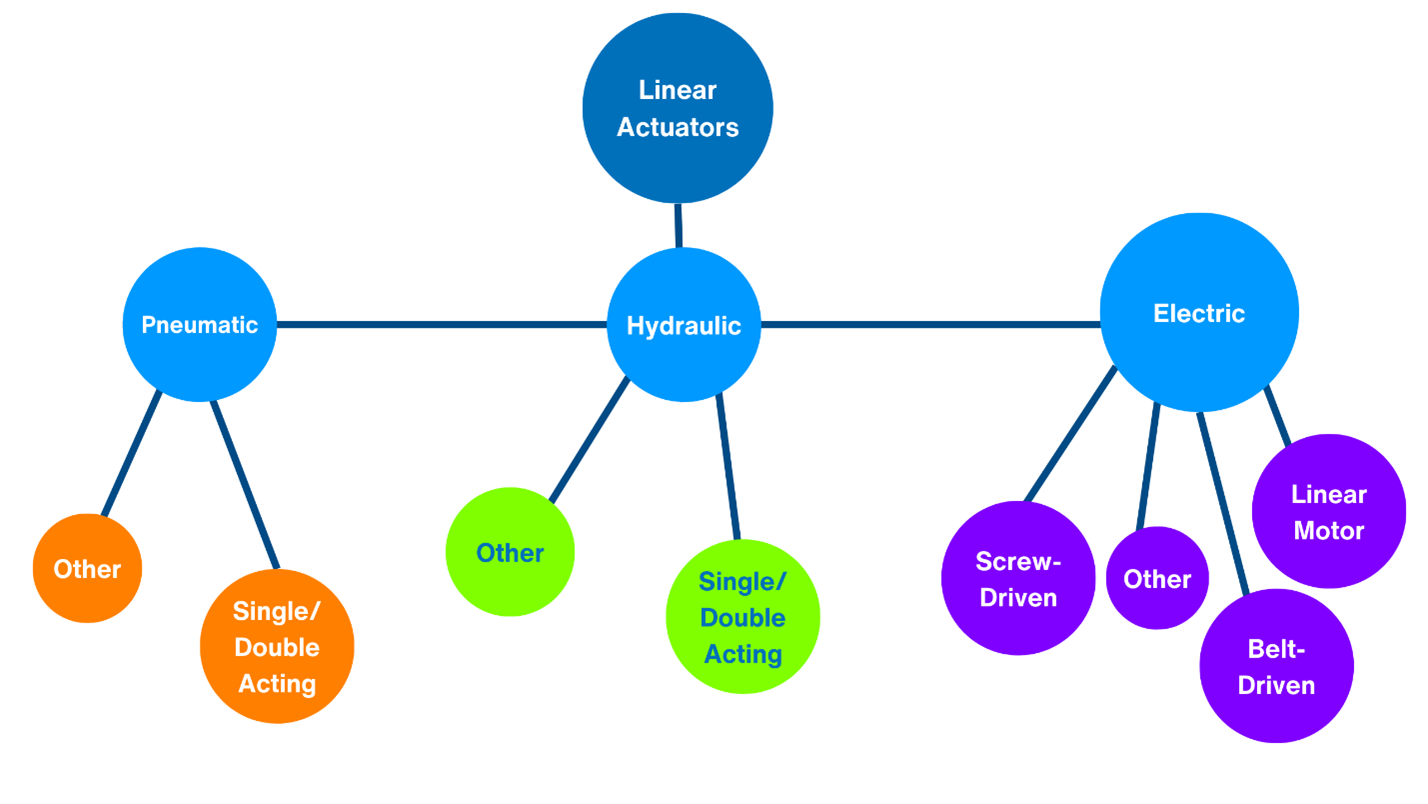Figure 2: The linear actuator family includes pneumatic, hydraulic, and electric options, each having sub-members. (Source: Author)