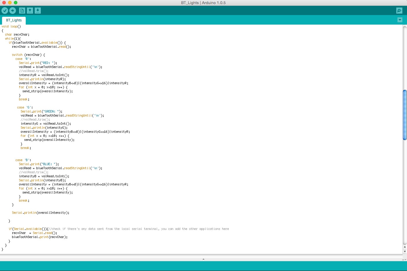 We need to write some code for the Arduino to receive this Bluetooth serial data and then act on it to vary the colors of the LEDs. The code may vary depending on your particular Bluetooth module, but the important thing to note is that to create the 24-bit integer for the LED strip that the blue LED value is logically shifted left 8 bits, green LED is shifted left 16 bits, and red LED is not shifted at all. Logically 'OR' the three values together to create the 24bit integer. See below how to do this.