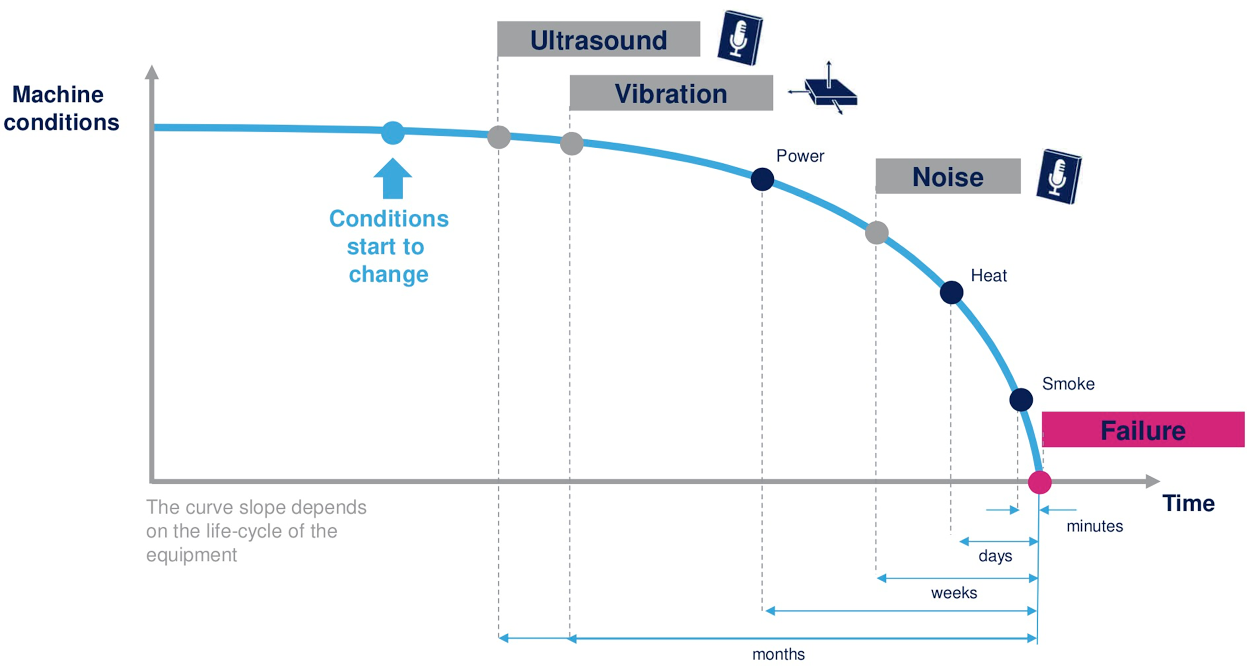 Figure 1: By analyzing data from multiple sensor types, machine-learning models in predictive maintenance applications can warn of impending machine failures well before they lead to equipment breakdowns. (Source: STMicroelectronics)