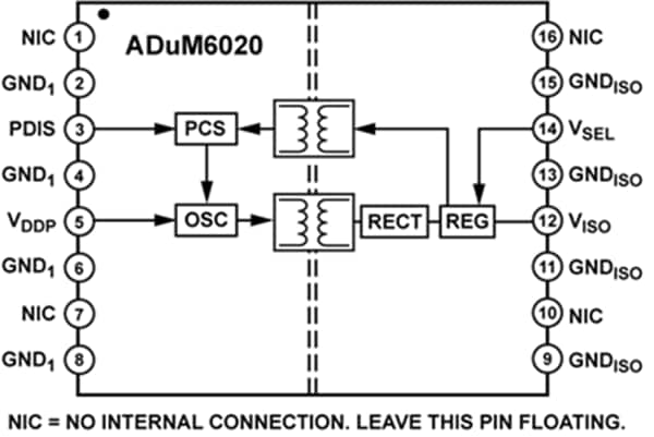 - 16-lead SOIC_W package with 7.8mm minimum creepage (ADuM6020)