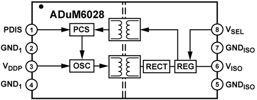- 8-lead SOIC_IC package with 8.3mm minimum creepage (ADuM6028)